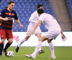 فاز فريق أساطير برشلونة على نظيره ريال مدريد 3/صفر في المباراة التي جمعت بينهما أمس، على إستاد الملك فهد الدولي في الرياض، بمناسبة مرور عام على تولي خادم الحرمين الشريفين الملك سلمان بن عبدالعزيز مقاليد الحكم، سجلها لوازانو "هدفان" وتشافي موليس.