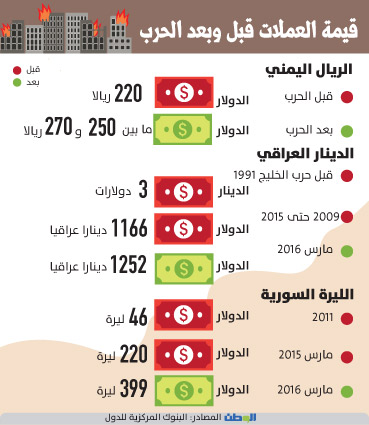 ففي اليمن على سبيل المثال، نجد أن الانهيار الأمني خلق بيئة خصبة لعمليات التهريب التي تستنزف العملة ما أدى لتراجع سعر الريال اليمني أمام الدو?ر، بحيث يصل سعر صرف الدولار إلى 270 ريالا بعد أن كانت قيمته 215 ريالا للدولار لعدة أعوام، و70 ريالا مقابل الريال السعودي بعد أن كان 57 ريالا، وسط توقعات بتزايد حدة تراجع قيمة الريال اليمني لما هو أكثر من ذلك على الرغم من محاولات الحكومة اليمنية لتفادي هذا الانهيار والتدهور من خلال إعادة تصدير النفط من الآبار التابعة، والتي عادت ملكيتها للحكومة مطلع العام الجاري، ففي زمن الحروب، تتوقف مصادر تمويل النقد الأجنبي جراء توقف الصادرات إلى الخارج، وتراجع تحويلات المغتربين ورحيل رجال الأعمال والمستثمرين، وما زاد الأمن سوءا في اليمن قرار الحوثيين بتعويم المشتقات النفطية من دون توفير النقد الأجنبي للتجار، حيث إن الحرب أدت إلى استنزاف جميع مدخرات اليمن من النقد الأجنبي، بما فيه الاحتياطي النقدي من الدولار، الذي تراجع من خمسة إلى 2.3 مليار دولار، ولا يزال في تدهور مستمر.