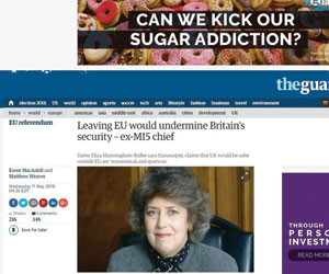 في تقرير لصحيفة "الجارديان" تحت عنوان "ترك الاتحاد الأوروبي سيضعف الأمن في بريطانيا"، نقلت الصحيفة عن رئيسة الاستخبارات البريطانية السابقة إليزا بوللا مانيجهام في خبرها "ترك الاتحاد الأوروبي سيضعف الأمن في بريطانيا"، قولها إن الادعاءات بأن بريطانيا ستكون خارج الاتحاد الأوروبي ستكون آمنة "لا معنى لها وزائفة"، مشيرة إلى أنه الآن ليس الوقت المناسب للانفصال عن الاتحاد الأوروبي. وأوضحت أنه من خلال مراجعة قائمة التهديدات التي ستواجه بريطانيا بعد خروجها من الاتحاد الأوروبي، فإن هذه التهديدات ستتزايد بدءا من إرهابيي داعش ووصولا إلى التهديد الروسي في ظل قيادة فلاديمير بوتين. وشارك مانينجهام التي خدمت في الاستخبارات الوطنية خلال الفترة 2002 – 2007 كل من زملائها جوناثان إيفانس وجون سواريس وريتشارد دير لوف الذين شغلوا مناصب قيادية.