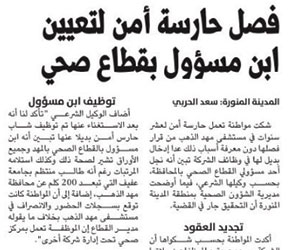 انتصرت الشؤون الصحية بمنطقة المدينة المنورة لحارسة أمن فصلت من عملها لتعيين ابن مسؤول بقطاع صحي في محافظة مهد الذهب بديلا عنها، وذلك بعد التحقيق في القضية وإبلاغ الوكيل الشرعي للمواطنة عن النية في إعادتها بعد فصل ابن مدير القطاع من عمله.