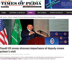 بدورها، قالت صحيفة تايمز أوف إنديا، الهندية، إن السفير السعودي بالولايات المتحدة، الأمير عبدالله بن فيصل، أكد أهمية زيارة ولي ولي العهد الأمير محمد بن سلمان إلى واشنطن، وقال "سيكون لها أثر كبير في رعاية وتطوير المصالح المشتركة بين البلدين، ذلك على ضوء الترحيب والاهتمام الرسمي الواسع النطاق الذي حظيت به من جانب المسؤولين الأميركيين". ونقلت الصحيفة عن السفير أن الزيارة تأتي في ظروف مواتية للغاية في أعقاب الإعلان عن "رؤية 2030" والحراك الاقتصادي المتمثل في برنامج التحول الوطني لمواجهة تحديات القرن الحادي والعشرين، والاستثمار في الفرص الاقتصادية الجديدة، التي يمثل التعاون بين المملكة والولايات المتحدة جانباً مهماً منها. ووصف زيارة سمو الأمير محمد بن سلمان بأنها فرصة عظيمة للتعريف بالتطورات الاقتصادية والحضارية التي تشهدها المملكة.