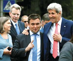 في الأثناء، توجه كيري إلى زيارة أوكرانيا أيضا حيث التقى الرئيس الأوكراني بيترو بوروشينكو ورئيس الوزراء فلاديمير جرويسمان، لبحث التعاون العسكري والمساعدات الأميركية لكييف وإجراء الإصلاحات في أوكرانيا، وتنفيذ اتفاقيات مينسك وغير ذلك من القضايا، فيما قالت وزارة الخارجية الأميركية إن الولايات المتحدة ستقدم مساعدات إنسانية إضافية بنحو 23 مليون دولار لمساعدة المضارين من الأزمة في شرق أوكرانيا، مشيرة إلى أن المساعدات الأخيرة سترفع القيمة الإجمالية لما قدمته أميركا لأوكرانيا إلى أكثر من 135 مليون دولار منذ اندلاع الأزمة.