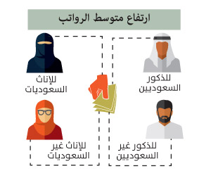 ارتفع متوسط رواتب القطاع الخاص خلال عام 2015 بنسب متفاوتة، ما بين الموظفين السعوديين وغير السعوديين عما كانت عليه عام 2014، حيث ارتفعت رواتب سعوديي القطاع الخاص بنسبة وصلت إلى 4 %، ليصل متوسط راتب السعودي إلى 6357 ريالا، وراتب السعودية إلى 3708 ريالات بنسبة ارتفاع تصل إلى 2 %.