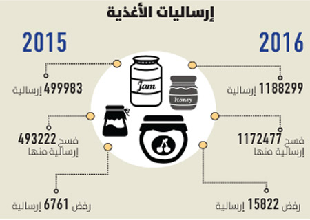 وشهد العام الماضي 2015 مراجعة 112786 منتجا غذائيا، وتسجيل 86548 منتجا منها، ورفض 17583 منتجات أخرى، وإعادة 8655 منتجا للتعديل، إضافة إلى وصول 499983 إرسالية غذائية، تم الإذن بفسح 493222 إرسالية منها، ولم يؤذن بفسح 6761 إرسالية.