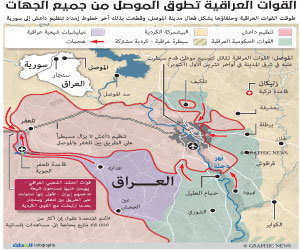 كما شهدت أحياء الزهراء والقادسية الثانية والتحرير أول من أمس، قصفا مدفعيا عنيفا من التنظيم على أماكن تمركز القوات العراقية، بعد تأكيد أحد قادته أنه تمت استعادة 40% من المحور الشرقي للمدينة. وقطعت القوات الحكومية العراقية أول من أمس، آخر خطوط إمداد داعش من الموصل باتجاه سورية، وبذلك يصبح التنظيم المتطرف مخنوقا ومحاصرا من جميع الجهات، ولم يتبق له أي مخرج يفر إليه من الموصل.