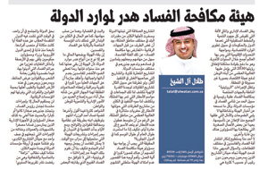 اطلعنا على المقال المنشور في صحيفة "الوطن"، ليوم الأربعاء 15 ربيع الأول 1438، الموافق 14 ديسمبر 2016 بعنوان "هيئة مكافحة الفساد هدر لموارد الدولة" للكاتب طلال آل الشيخ.