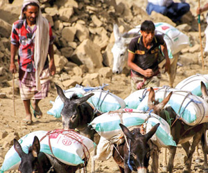 وعمدت الميليشيات بشكل متواصل على نهب المساعدات الإنسانية وبيعها في السوق السوداء، واستخدام ريعها في دعم ما يسمى بالمجهود الحربي. كما منعت القوافل الإغاثية من دخول المدن المحاصرة.