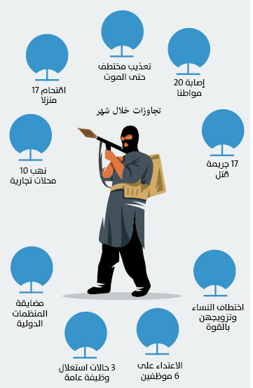 أشار التقرير إلى 32 حالة اختطاف لطاقم منظمات طبية دولية، وموظفين حكوميين، إضافة إلى اقتحام 17 منزلا ومحلا ومؤسسة، واحتلال منزل مواطن وتحويله إلى سكن لمسلحي الميليشيات، و10 حالات نهب لمحلات ومؤسسات تجارية أخرى.