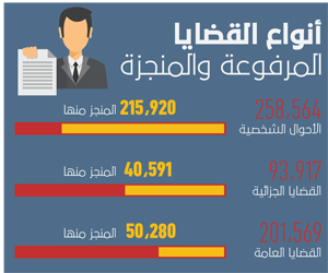 وحدد لجميع الجلسات المنتهية والمتبقية حتى الآن 911 ألفا و735 جلسة للنظر فيها. وبحسب خدمة المؤشرات القضائية، فقد شكلت قضايا الأحوال الشخصية الواردة 258 ألفا و564 قضية، أنهت المحاكم الابتدائية منها 215 ألفا و920 قضية. وبلغ عدد القضايا الجزائية 93 ألفا و917 قضية، أنهت المحاكم الابتدائية منها 40 ألفا و591 قضية، فيما بلغت القضايا العامة الواردة إلى المحاكم الابتدائية 201 ألف و569 قضية، تم الانتهاء من 50 ألفا و280 قضية. وفيما بلغ عدد الجلسات المحددة للقضية الواحدة حتى اللحظة 1.64، علما بأن بعض القضايا غير منتهية بلغت المواعيد المسجلة في أسبوعين وأقل 395 ألفا و580 موعدا بنسبة 43.39 % من إجمالي المواعيد. أما المواعيد المحددة من أسبوعين إلى شهر فقد بلغت 112 ألفا و624 موعدا بنسبة 12.35 %. وبلغت المواعيد المسجلة من شهر إلى شهرين 206 آلاف و285 موعدا بنسبة 22.63 %، كما سجلت المواعيد من شهرين إلى 3 أشهر 125 ألفا و457 موعدا بنسبة 13.76 %، وسجلت المواعيد من 3 أشهر حتى 4 أشهر 47 ألفا و972 موعدا بنسبة 5.26 %، والمواعيد من 4 أشهر حتى 5 أشهر 14 ألفا و932 بنسبة 1.64 %، والمواعيد من 5 أشهر إلى سنة 8814 بنسبة 0.97 %، والمواعيد على فترات تصل إلى أكثر من سنة 71 بنسبة 0.01 %.