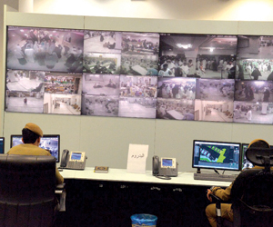 يرصد أكثر من 60 رجل أمن داخل غرفة المراقبة الأمنية بالحرم المكي عبر كنسولات مرتبطة بمجموعة من الشاشات، متابعة حركة الحشود والحالة الأمنية داخل الحرم المكي، عبر أكثر من 2200 كاميرا متطورة تنقلها 257 شاشة رقمية متطورة.