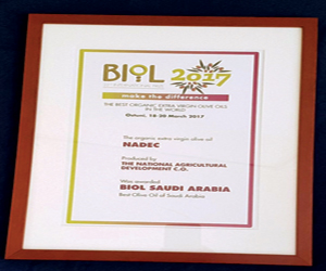 كرمت وزارة الزراعة الإيطالية الشركة الوطنية للتنمية الزراعية «نادك» لحصولها على شهادة الزراعة العضوية لمنتج زيت الزيتون BIOL لعام 2017، حيث منحت هذه الشهادة من قبل مركز الأبحاث العالمية لاختبارات الجودة الشاملة BIOL وهو المركز العالمي المتخصص في تقييم معايير الجودة في منتجات زيت الزيتون على مستوى العالم وفق تطبيقه لمعايير دقيقة وشاملة لكافة مراحل الإنتاج لدى الشركات المصنعة. واستلم الشهادة نيابة عن الشركة الملحق التجاري السعودي بروما مما يدل على حرص الدولة ممثلة في سفاراتها وممثليها حول العالم في دعم ومساندة المنتج المحلي والشركات الوطنية. وأكد العضو المنتدب للشركة المهندس عبدالعزيز البابطين، أن تكريم نادك هو تكريم للمملكة ممثلة بوزارتي البيئة والمياه والزراعة ووزارة التجارة، كاشفا عن عدد المتقدمين لنيل هذه الشهادة والمنافسة عليها في كل عام لا يقل عن 350 شركة منتجة لزيت الزيتون العضوي من جميع أنحاء العالم.