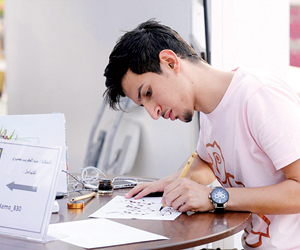 لم يكن الرسم هو الفن الوحيد الذي يبرز في «شارع الفن» الذي تتواصل فعالياته حاليا ضمن مهرجان «أبها يجمعنا 2017»، فللخط العربي حضوره اللافت خلال مشاركة عدد من الخطاطين، منهم الشاب عبدالكريم ناجي شبيب، الذي يتحدث عن تجربته قائلا«بدأت في تعلم فن الخط منذ 10 سنوات، وحصلت على عدد من الدورات التدريبية، حتى أتقنت عدة أنواع من الخطوط منها، النسخ والرقعة والديواني، وشاركت في تنفيذ كثير من الأعمال، أهمها جدارية بمقاس 60 مترا مربعا مقابل المكتبة العامة بأبها».