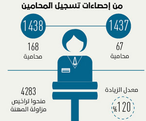كشفت وزارة العدل منحها تراخيص ممارسة مهنة المحاماة لـ168 محامية بزيادة قدرها 120% بعد أن سجلت الوزارة التراخيص لـ67 محامية حتى مطلع عام 1437، وبين مصدر مسؤول في الوزارة لـ«الوطن» أن العدل منحت 4283 ترخيص محاماة في كافة مناطق المملكة وذلك وفق أحدث إحصائية.