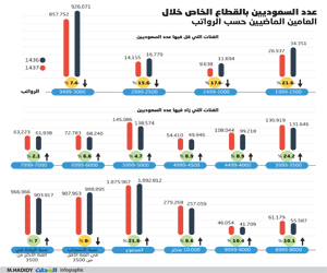 انسحب 16.845 ألف موظف سعودي من العمل بالقطاع الخاص خلال العام الماضي، يمثلون ما نسبته 1% من سعوديي القطاع الخاص، أغلبهم ممن تقل رواتبهم عن 3500 ريال، حيث انخفضت نسبتهم في القطاع الخاص حتى 8%، في حين استقطبت الوظائف بالرواتب الأعلى من 3500 أعدادا إضافية، لتزداد نسبة السعوديين ممن تزيد رواتبهم عن 3500 حوالي 7%.
