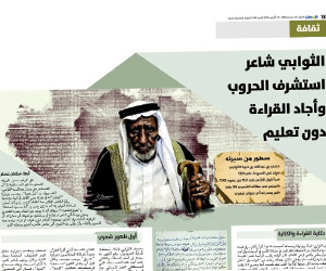 توفي أمس الشاعر الشعبي علي بن خبية الثوابي في مستشفى عسير المركزي بعد معاناة طويلة من المرض، عن عمر يناهز الـ108 أعوام، ويعد الثوابي أحد أبرز شعراء منطقة عسير، حيث قضى أكثر من 90 عاما في ميدان الشعر، وعرف عنه غزارة إنتاجه الشعري، وسرعة بديهته، كما عرف عنه تميزه المنفرد في لون «الدمة»، وكانت «الوطن» قد التقت به في حوار خاص بمنزله في حي القابل بأبها العام الماضي، وكشف عن عدة أسرار، منها استشرافه للحروب منذ زمن طويل، وكيفية إجادته للقراءة والكتابة دون تعليم، وأصر حينها أنه لايزال يتربع على هرم الشعر في المنطقة، واصفا نفسه «بأنه سيد الساحة». ويعتبر عدد من أبناء منطقة عسير الشاعر الثوابي هرما للشعر في المنطقة، وقد حرص الثوابي على كتابة أشعاره على أوراق محفوظة بطريقة بدائية في منزله، وبوفاته تكون الساحة الشعبية في عسير قد فقدت هرم الشعر الشعبي، والذي عرف بدهائه، وسرعة رده، ولا يزال الكثيرون يتغنون بكلماته والتي امتدت لأكثر من 9 عقود.
