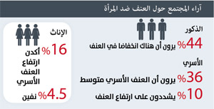 وكشفت المنيف عن نتائج استطلاع آراء المجتمع حول العنف ضد المرأة وبرامج التمكين الخاصة بها، بالتعاون مع المركز الوطني لاستطلاعات الرأي العام، حيث بلغت عينة الاستطلاع 1199 مواطنا، 69% منهم من الذكور، و80% من المشاركين متزوجون.