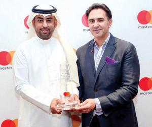 تسلّم الجائزة نيابة عن البنك رئيس المصرفية الإلكترونية للشركات فيصل العمودي، من مدير عام ماستركارد بالسعودية ودول المشرق العربي باسل التل.