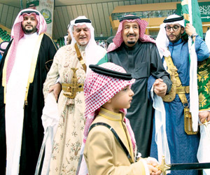 لدى وصول خادم الحرمين الشريفين، مقر الحفل بالصالات الرياضية يرافقه الأمير راكان بن سلمان بن عبدالعزيز، والأمير فيصل بن أحمد بن سلمان بن عبدالعزيز، والأمير عبدالعزيز بن خالد بن سلمان بن عبدالعزيز، كان في استقبال الملك سلمان، المستشار الخاص لخادم الحرمين الشريفين الأمير عبدالإله بن عبدالعزيز آل سعود، وأمير منطقة الرياض الأمير فيصل بن بندر بن عبدالعزيز، والأمير متعب بن عبدالله بن عبدالعزيز، ووزير الحرس الوطني رئيس اللجنة العليا للمهرجان الوطني للتراث والثقافة، الأمير خالد بن عبدالعزيز بن عياف، والمستشار في الديوان الملكي الأمير تركي بن محمد بن فهد بن عبدالعزيز، ونائب أمير منطقة الرياض الأمير محمد بن عبدالرحمن بن عبدالعزيز، ووزير الداخلية الأمير عبدالعزيز بن سعود بن نايف بن عبدالعزيز، ونائب وزير الحرس الوطني نائب رئيس اللجنة العليا للمهرجان عبدالمحسن بن عبدالعزيز التويجري.