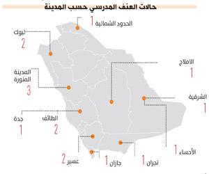 تصدرت المدينة المنورة عدد حالات العنف في المدارس خلال الشهرين الماضيين بـ 3 حالات، وفي الحالة الأخيرة أكد المتحدث الإعلامي لشرطة المنطقة الرائد حسين القحطاني، ورود بلاغ الأحد الماضي، إلى مخفر شرطة قرية الحسو التابع لمحافظة الحناكية من مستشفى الحسو العام، بدخول شخص إثر تعرضه لإصابة في الرأس. وقال: «بانتقال المختصين إلى المستشفى؛ تَبَيّن أن معلما بمدرسة خالد بن حزام المتوسطة، قام بالاعتداء عليه أحد طلبة المدرسة التي يعمل بها؛ وذلك برميه بحجر على رأسه، وإصابته بجرح قطعي حُددت مدة شفائه بـ7 أيام».