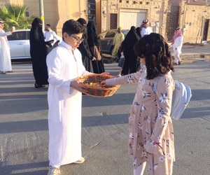 بادر عدد من الأطفال بتوزيع حلوى العيد على المارة في شوارع الرياض وبالقرب من الجوامع ومصليات العيد أول من أمس، وهي عادة اجتماعية مترسّخة في المجتمع السعودي.