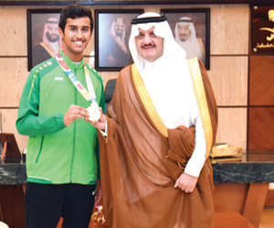 وأشاد بما بذله من جهود مع كافة زملائه من أجل تحقيق الميدالية الذهبية، مؤكدا اهتمام حكومة الملك سلمان بن عبدالعزيز ولي العهد الأمير محمد بن سلمان المستمر بأبناء الوطن الشباب والشابات الرياضيين بكافة الفئات والأنشطة الرياضية، وبكل ما يسهم في رفع وتطوير الرياضة.