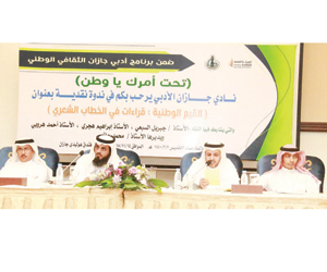 عقدت ندوة نقدية عن القيم الوطنية ضمن البرنامج الثقافي الوطني لنادي جازان الأدبي بعنوان «تحت أمرك يا وطن»، شارك فيها الناقد الأدبي أحمد هروبي، والناقد الأدبي جبريل السبعي، والناقد الأدبي إبراهيم هجري، وأدار الأمسية الوطنية النقدية محمد عاتي، وسط حضور مميز من أبناء وبنات الوطن، كما شكر رئيس نادي جازان الأدبي حسن بن أحمد الصلهبي النقاد الثلاثة ومدير الندوة وكرمهم النادي بهذه المناسبة.