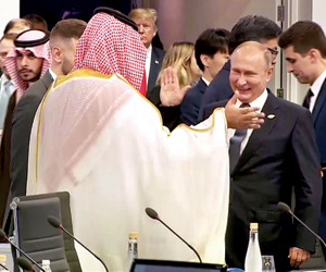وتصافح الأمير محمد بن سلمان، مع الرئيس الروسي فلاديمير بوتين وتبادلا الابتسامات والشد على الأيدي خلال التقاط الصورة الجماعية لزعماء أكبر الاقتصادات في العالم.