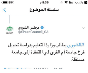 قال عضو مجلس الشورى الدكتور أحمد بن عمر الزيلعي في تغريدة له على موقع «تويتر»، إن «توصية مجلس الشورى بتحويل فرع جامعة أم القرى بمحافظة القنفذة إلى جامعة يأتي اقتناعا من أعضاء المجلس باستيفاء القنفذة لجميع متطلبات الجامعة من حيث عدد الكليات المتخصصة، والعمادات المساندة، والآلاف المؤلفة من خريجي المدارس الثانوية بها بنين وبنات».